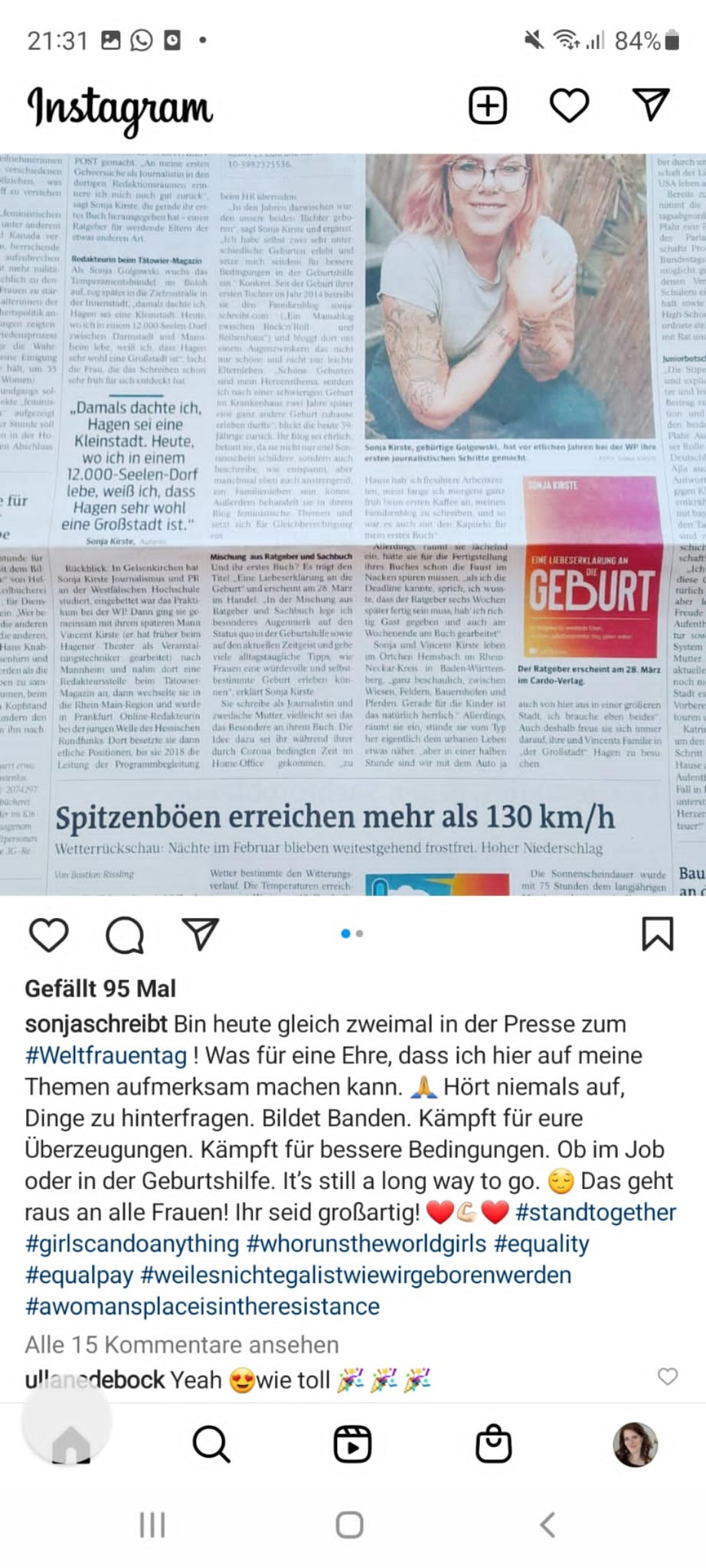 "Danke, dass ich das Buch vorher schon lesen durfte. Ich finde es besonders dann stark, wenn du von deinen eigenen Erlebnissen berichtest und auch erklärst, was ich als werdende Mutter eigentlich tun kann, um ein bisschen mehr Selbstbestimmung zurück zu bekommen. Ich finde es auch toll, dass in deinem Buch auch andere Frauen von ihren Geburten berichten."