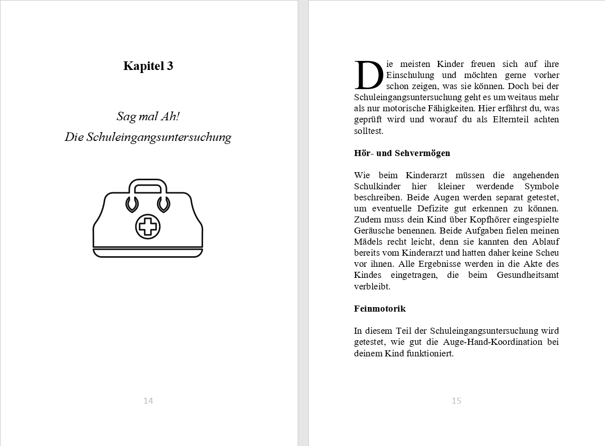 Autorin Herrmann beschreibt und ordnet ein – so ist auch der Termin zur Schuleingangsuntersuchung keine Black Box mehr. Was die Ergebnisse aussagen, und was nicht, wird klar benannt. Typische Eltern-Sorgen können entkräftet werden, für ernstzunehmende Probleme gibt es konstruktive Lösungsansätze. Und für alle, die schon immer mal Mäuschen spielen wollten: Kleine Einblicke in den Klassenzimmeralltag finden sich in diesem nützlichen Ratgeber ebenfalls.